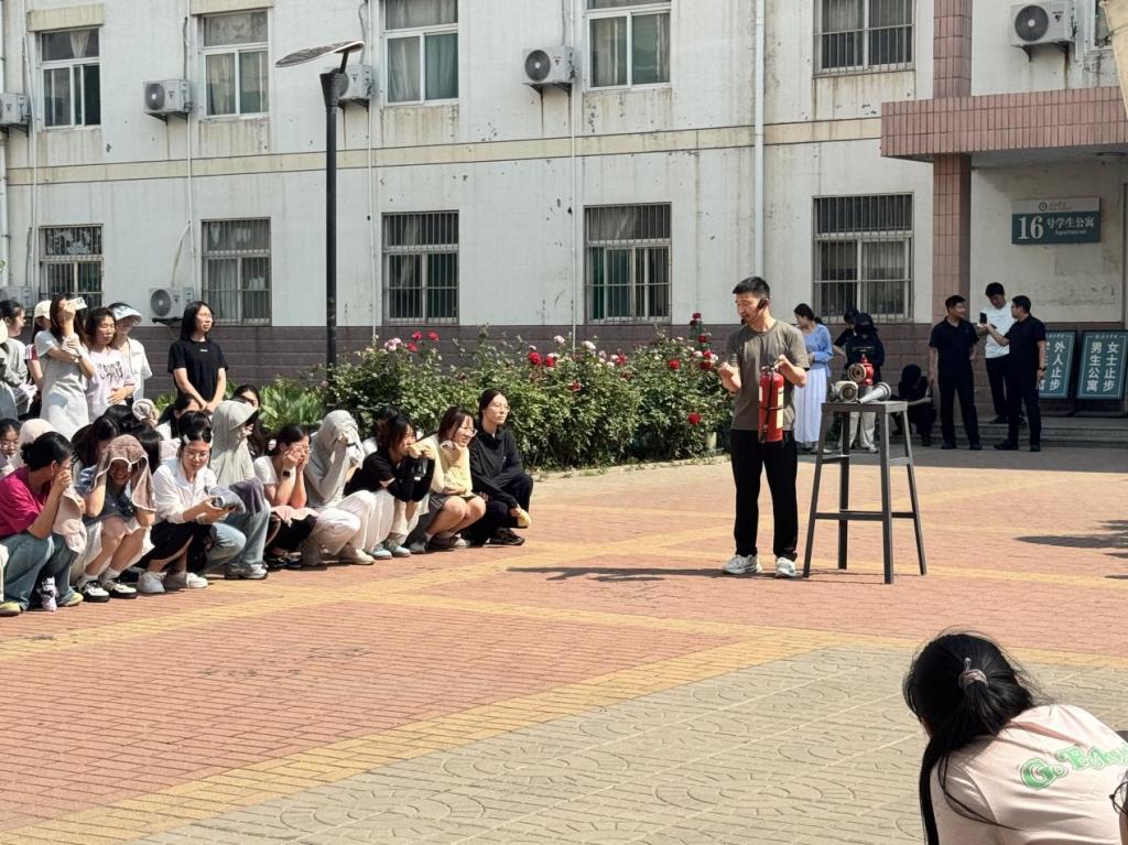 随着警报声响起,同学们迅速反应,在老师和公寓管理员的指引下,用湿毛巾捂住口鼻,弯腰沿墙有序撤离。大家严格按照预定路线疏散,快速抵达公寓广场集合点,整个过程紧张有序,展现了良好的应急能力。与此同时,学院应急小组迅速行动,模拟灭火、维持秩序,为演练增添实战效果。演练结束后,保卫处工作人员为同学们讲授了一堂生动的“安全课”,大家认真聆听消防知识讲解,并积极参与灭火器使用实操练习,掌握了正确的消防技能。